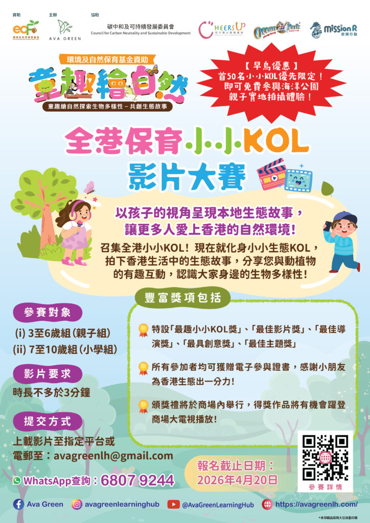 誠邀全港學童躍身成為「綠色小小KOL」,不僅要在幕後掌鏡,更需走到鏡頭前,以自信風采擔綱生態導賞員。本計劃鼓勵參加者攝製三分鐘以內的影片,親身演繹並深入探討香港錯綜複雜而生機勃勃的生態系統與動物棲息地。